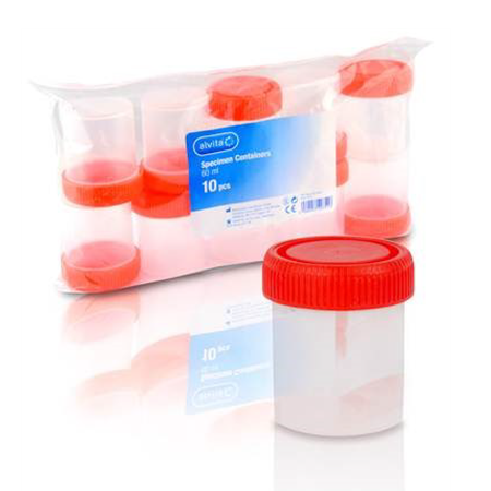 The Alvita Specimen container is ideal for capturing and transporting medical samples. It will hold up to 60ml of fluid and has a secure screw top. The container is sterile, and made from virgin polystyrene. All materials are non-...cytotoxic.