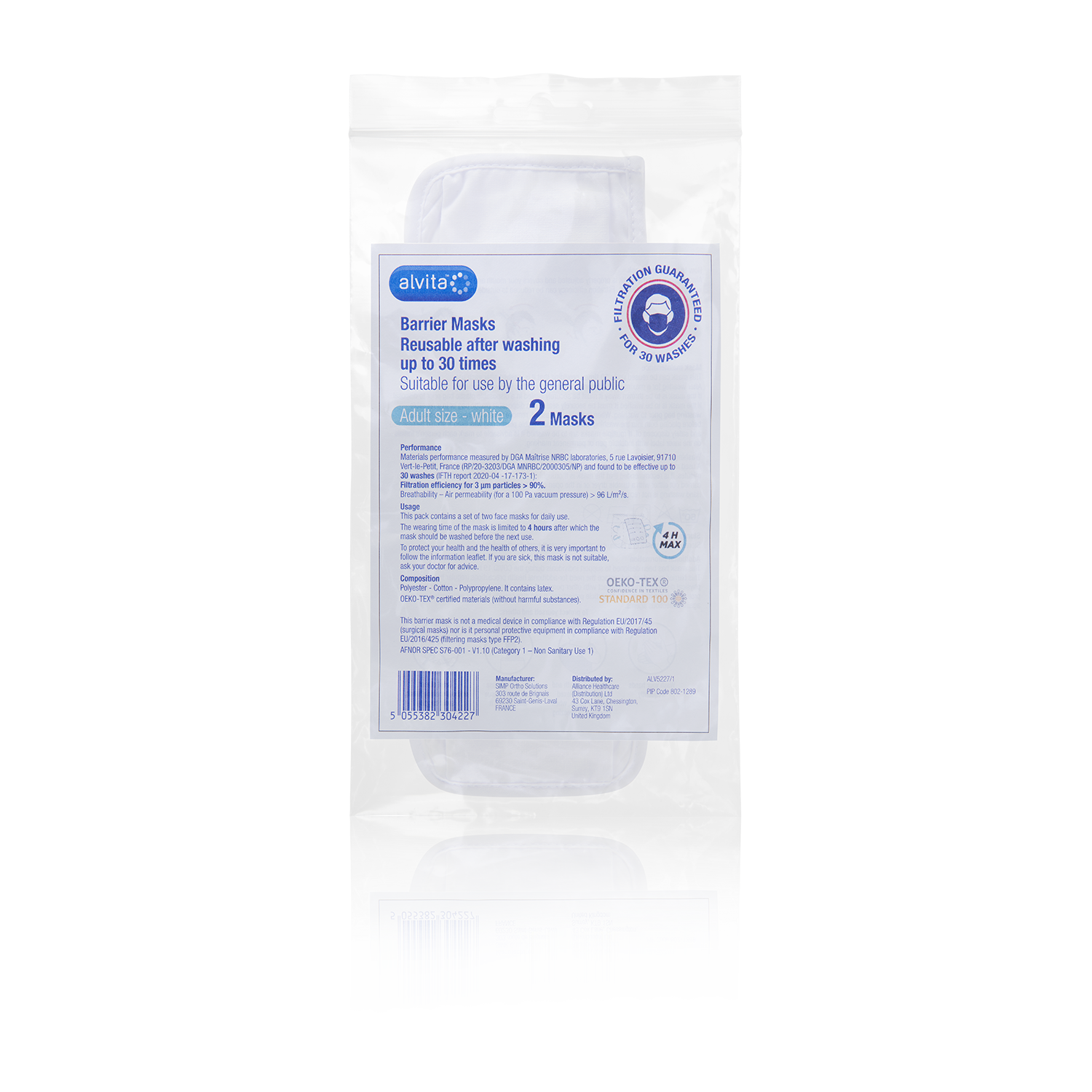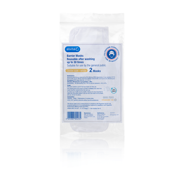 Materials performance measured by DGA Maitrise NRBC laboratories, 5 rue Lavoisier, 91710 Vert-le-Petit, France (RP/20-3203/DGA MNRBC/2000305/NP) and found to be effective up to 30 washes (IFTH report 2020-04-13-173-1):