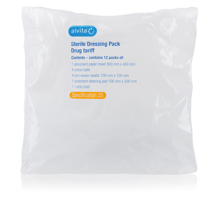 The Alvita Sterile Dressing Packs contain all the necessary products for the dressing of wounds in a compact form, conforming to Drug Tariff specifications. Spec 10 dressing pack includes an absorbent paper towel (500mm x 450mm),... four cotton balls, four gauze swabs (100mm x 100mm) and an absorbent dressing pad (100mm x 200mm). Spec 30 dressing pack includes an absorbent paper towel (500mm x 450mm), four cotton balls, four non-woven swabs (100mm x 100mm) and an absorbent dressing pad (100mm x 200mm).
