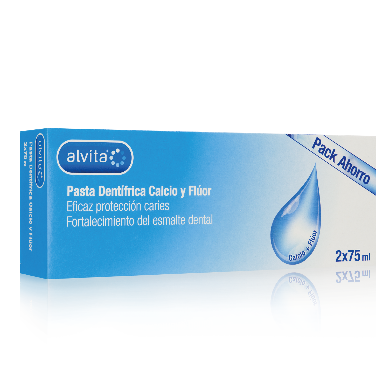 La Pasta dentífrica Alvita calcio y flúor refuerza el esmalte y protege contra la caries manteniendo los dientes sanos y fuertes. Su uso diario contribuye a una correcta higiene bucal proporcionando una agradable sensación de fresco...r a menta. Contiene monofluorofosfato de sodio y fluoruro de sodio (1490 ppm ión flúor). Cada estuche contiene dos pastas dentífricas de 75 ml. Solo para adultos.