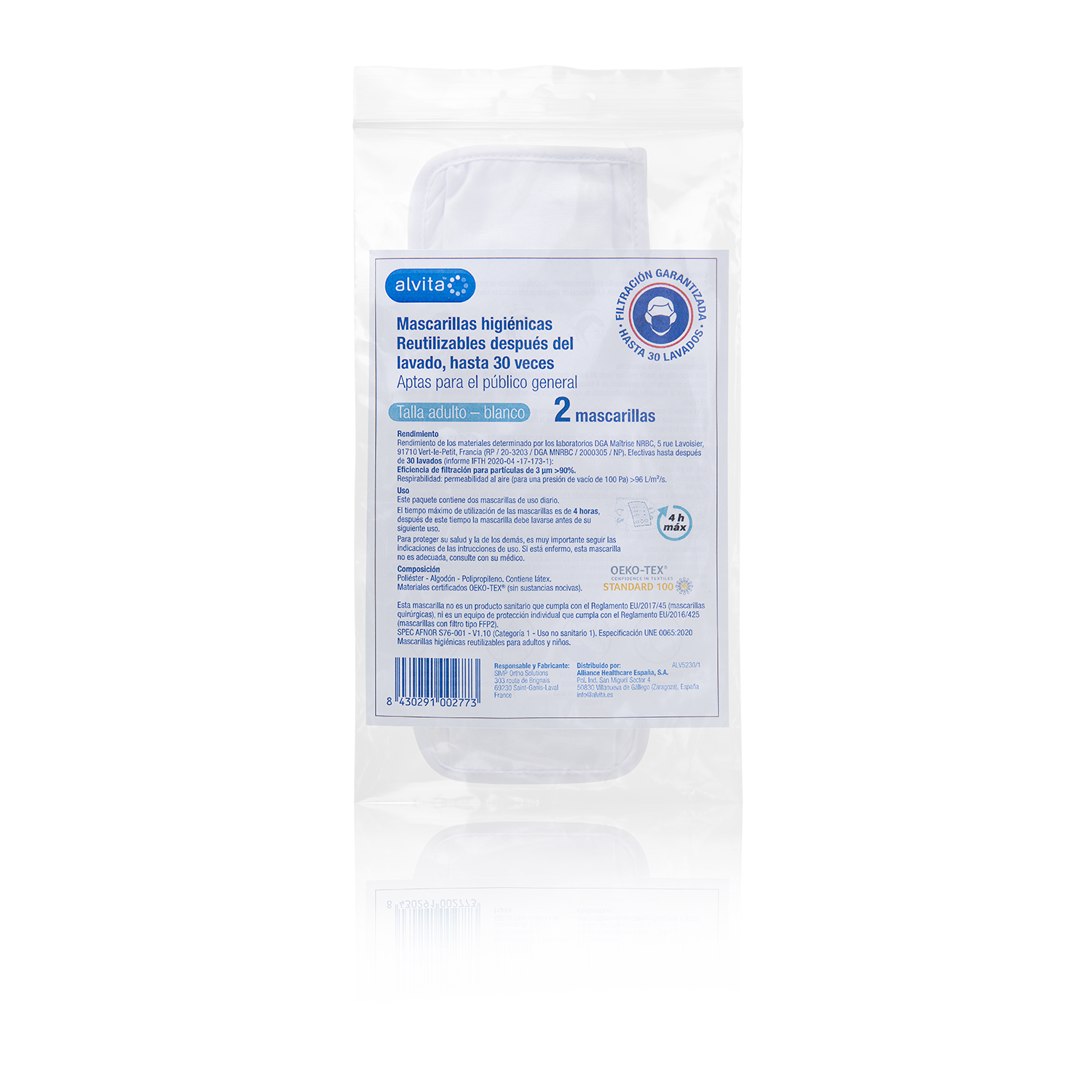 - Esta mascarilla se puede reutilizar hasta 30 veces, siempre que se lave después de cada uso (una mascarilla usada debe lavarse a máquina con detergente para ropa convencional a 60 °C durante al menos 30 minutos. No se recomienda el lavado a mano).