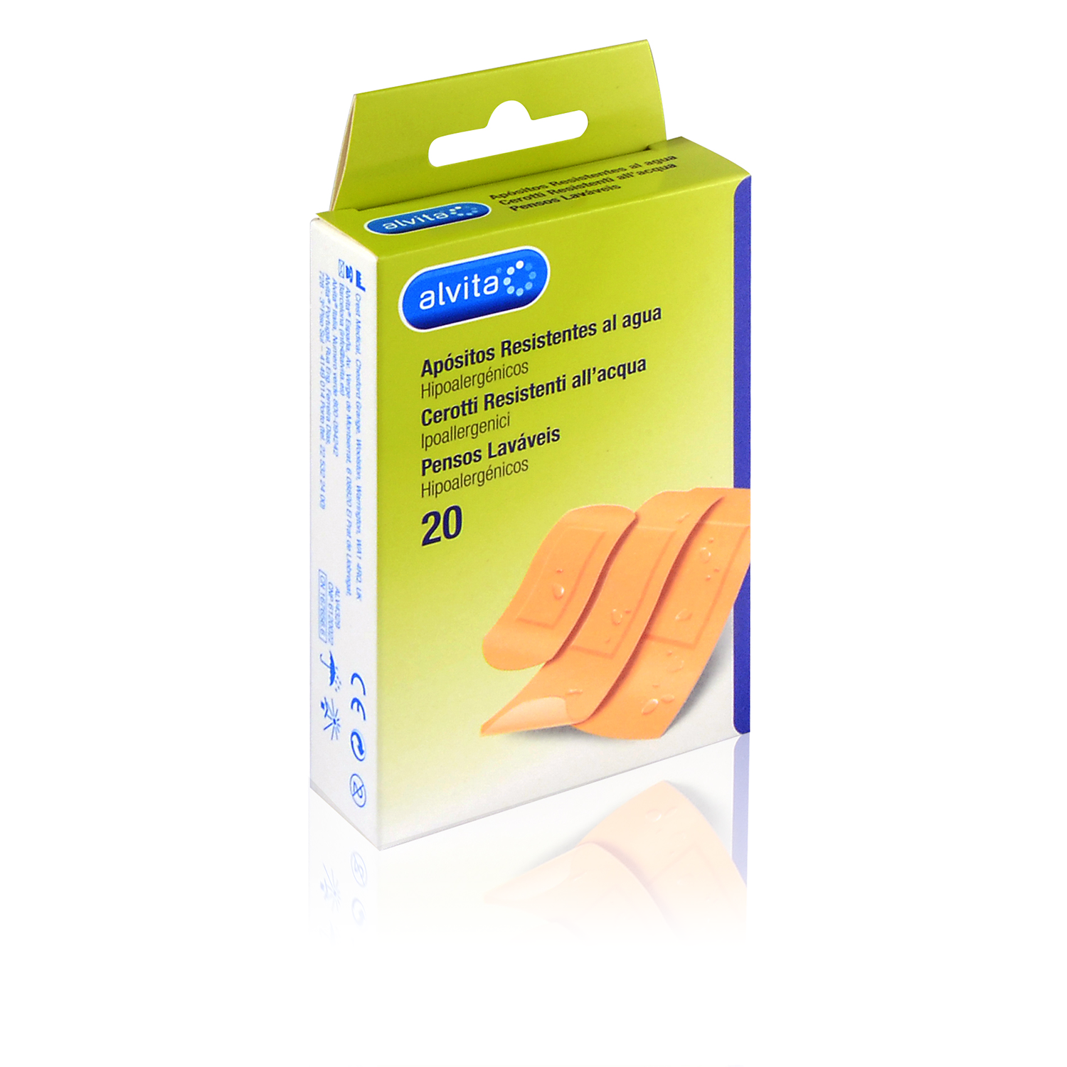 Los Apósitos resistentes al agua Alvita son hipoalergénicos (sin látex), suaves para las pieles delicadas, transpirables para ayudar a la cicatrización, flexibles para una mayor comodidad y protegen la herida del agua. Protegen cort...es y heridas superficiales una vez se ha detenido el sangrado. Sustituir el apósito por otro nuevo según la necesidad, mínimo una vez al día. Cada estuche contiene 4 apósitos de 30 mm x 72 mm, 6 apósitos de 19 mm x 38 mm y 10 apósitos de 19 mm x 72 mm.