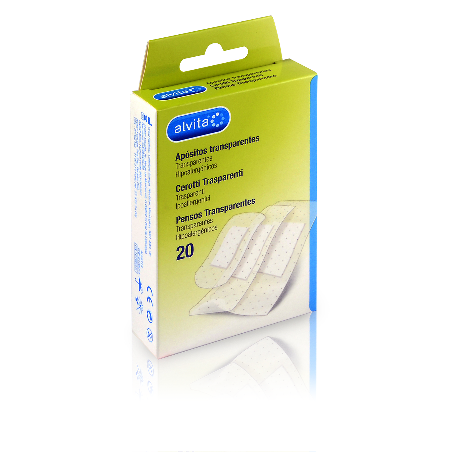 Los Apósitos transparentes Alvita son hipoalergénicos (sin látex), suaves para las pieles delicadas, transpirables para ayudar a la cicatrización, flexibles para una mayor comodidad y transparentes para una protección discreta. Prot...egen cortes y heridas superficiales una vez se ha detenido el sangrado. Sustituir el apósito por otro nuevo según la necesidad, mínimo una vez al día. Cada estuche contiene 4 apósitos de 30 mm x 72 mm, 6 apósitos de 19 mm x 38 mm y 10 apósitos de 19 mm x 72 mm.