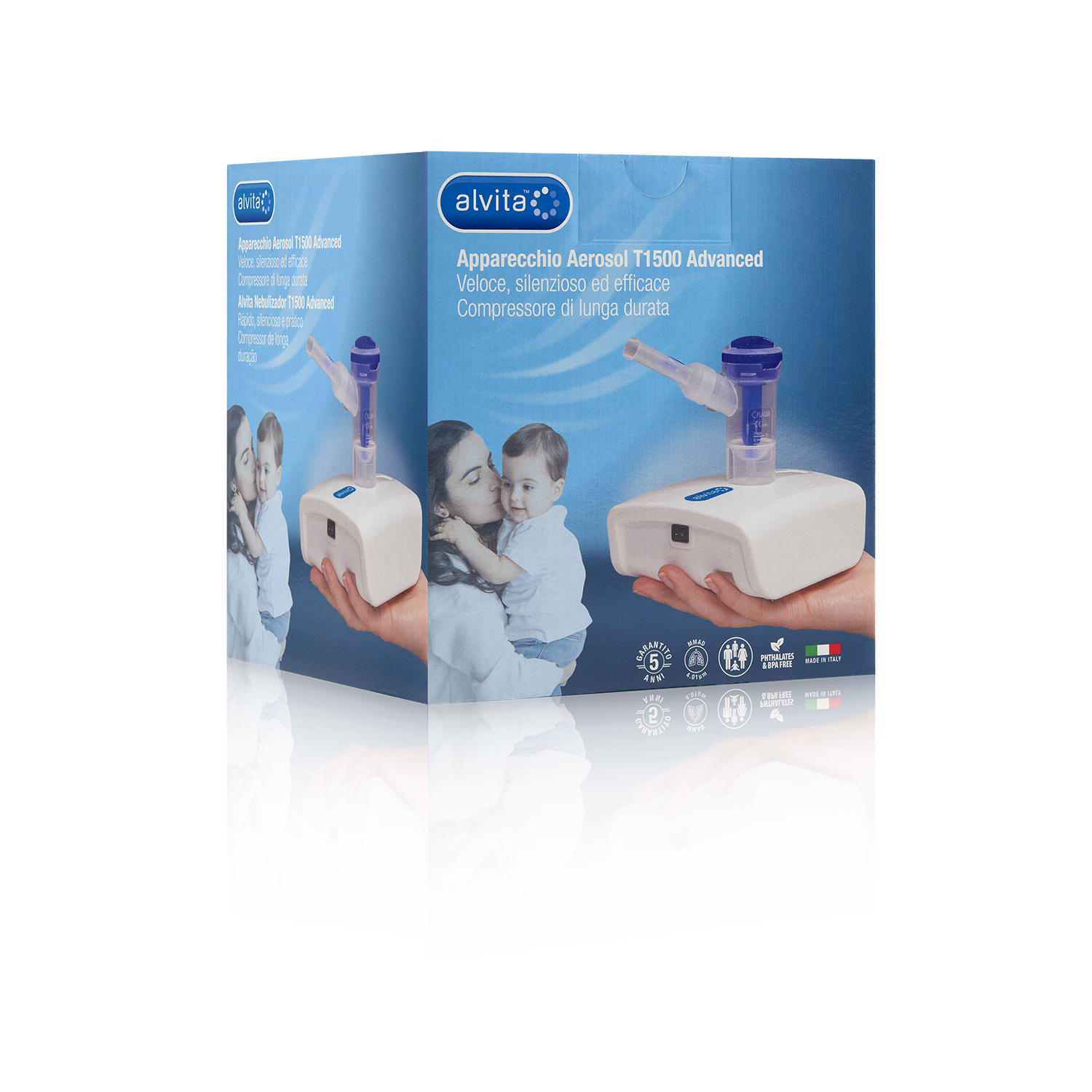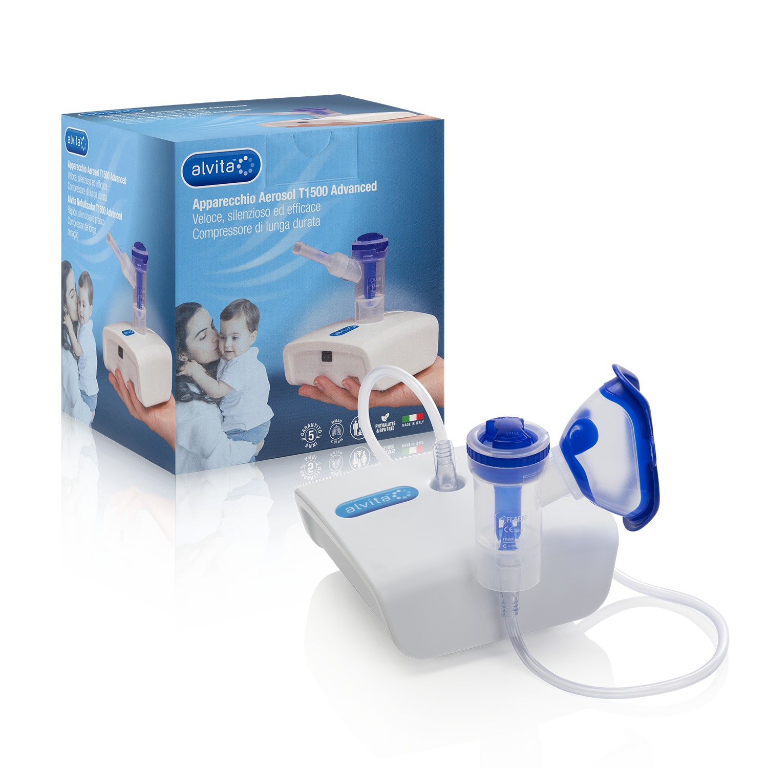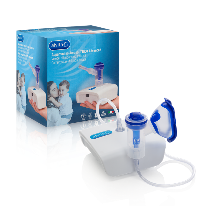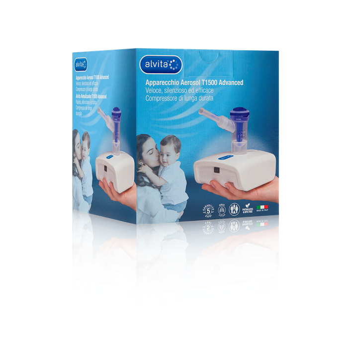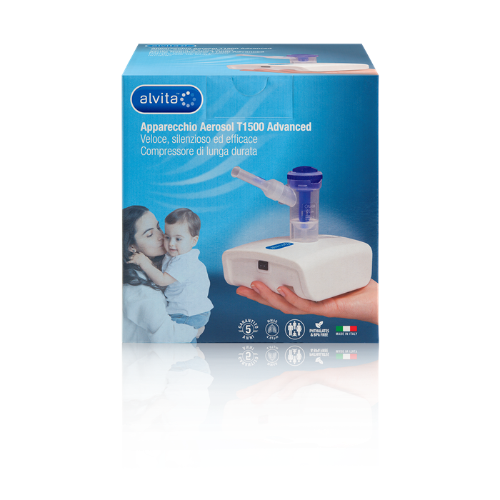 L'apparecchio aerosol Alvita T1500 advanced permette di effettuare una terapia aerosol con particelle nebulizzate di piccole dimensioni adatte al trattamento di malattie respiratorie come asma, bronchite e allergie. Puo' essere uti...lizzato da tutta la famiglia, i farmaci possono essere somministrati anche con una ridotta coordinaziaone del respiro, ad esempio nei bambini la nebulizzazione raggiunge l'apparato respiratorio anche con bassi volumi respiratori. Il dispositivo permette la nubulizzazione del farmaco in modo efficace riducendo i tempi impiegati per la terapia: la bassa rumorosita' del compressore aumenta il comfort della terapia. Le mascherine in dotazione sono realizzate con materiali privi di ftalati e BPA. Sono state progettate con un margine esterno a contatto con l'epidermide con un materiali morbido e biocompatibile per garantire la massima aderenza a contatto con il viso.